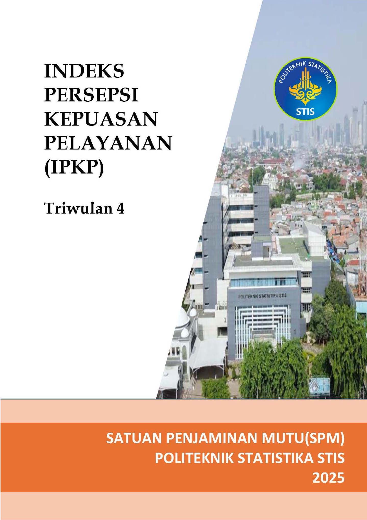 Indeks Persepsi Kualitas Pelayanan (IPKP) Triwulan IV Tahun 2025 dihitung berdasarkan Survei Persepsi Kualitas Pelayanan (SPKP) Triwulan IV Tahun 2025. Indeks ini digunakan untuk mengetahui tingkat kepuasan mahasiswa terhadap layanan dari masing-masing unit kegiatan yang dinilai berdasarkan 9 unsur dan menjadi bahan evaluasi untuk Politeknik Statistika STIS dalam pengembangan pelayanan ke depan.